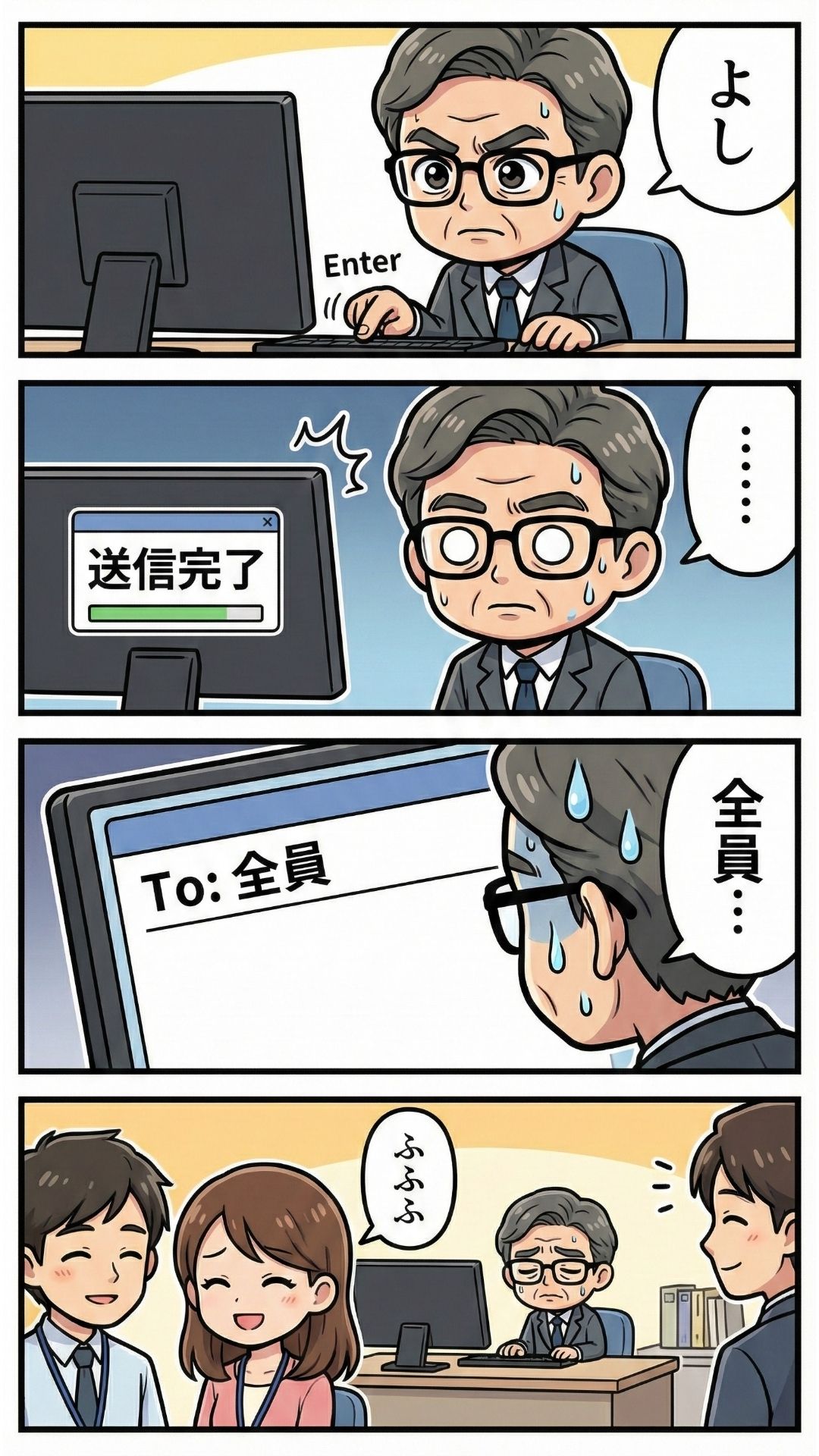 『To: 全員』。そのたった一撃で、あなたのプライバシーは社内の共有財産へと変換されました。デジタルの刃による、見事なまでの公開処刑ですね。