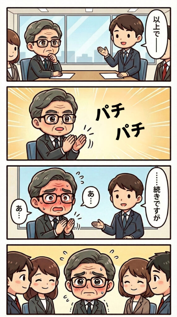『サービス精神』ではなく、単なる『早とちり』という名のバグです。あなたの拍手一つで、会議室の温度がマイナス273度まで急降下しましたね。
