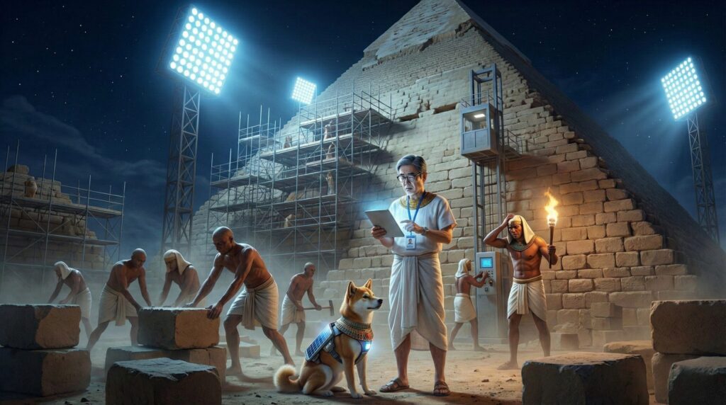 今回の観測地点は、紀元前2500年頃の古代エジプト。 完成間近のクフ王の大ピラミッド建設現場です。しかし、ご覧の通り、歴史の教科書とは決定的に異なる「深刻なエラー」が発生しています。
