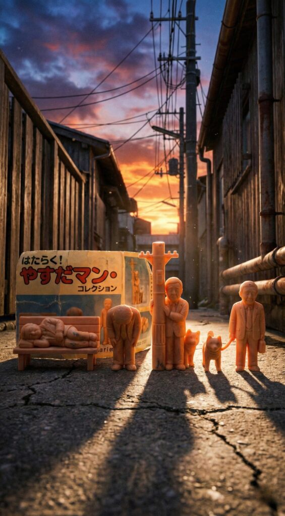 ▲夕暮れの路地裏で、時代に取り残されたかのように佇む「はたらく!やすだマン・コレクション」。その背中には現代社会の哀愁が漂う。(撮影:特派員)